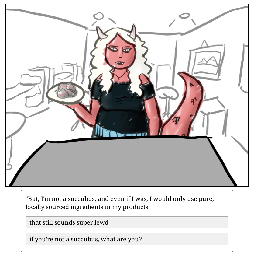 This is a silly little made-from-scratch game about being a food columnist in a city of monster girls. it only has one monster girl yet and only one minigame (and a dialog tree that will lead to an second minigame)